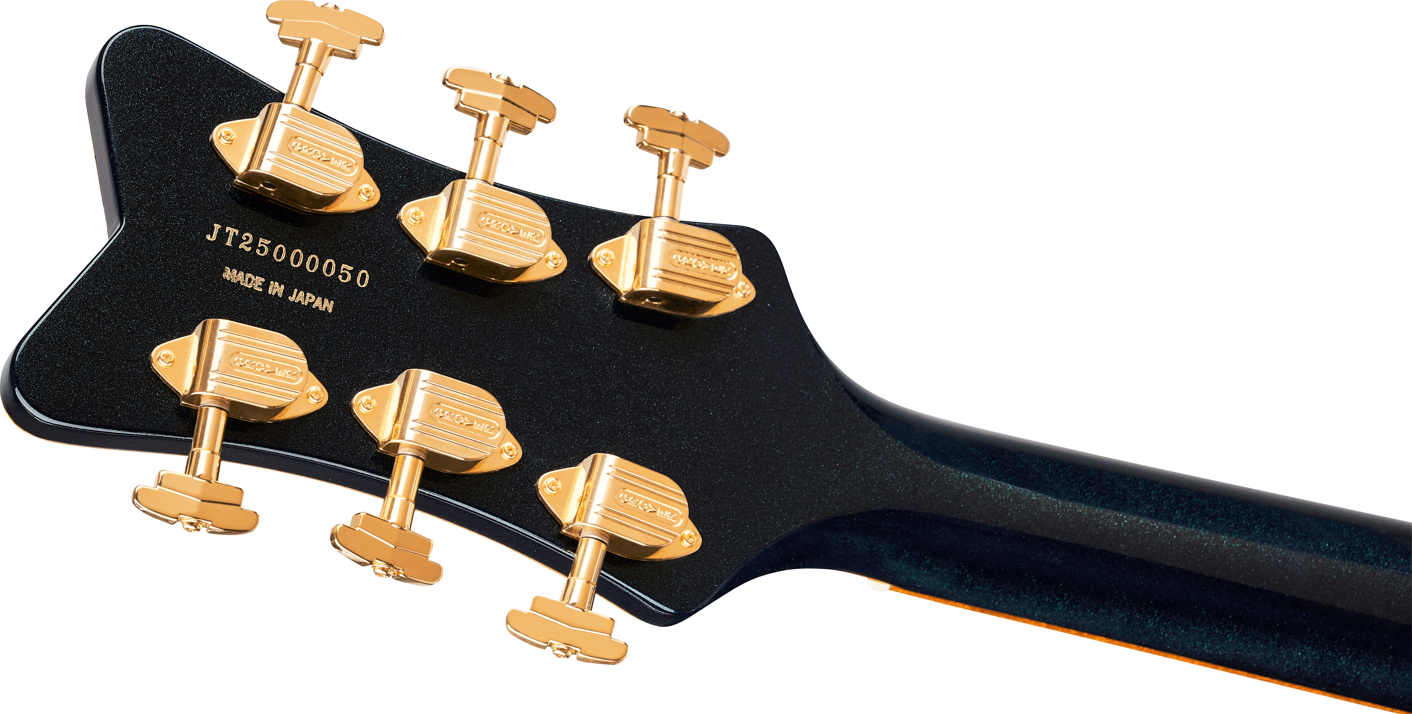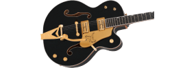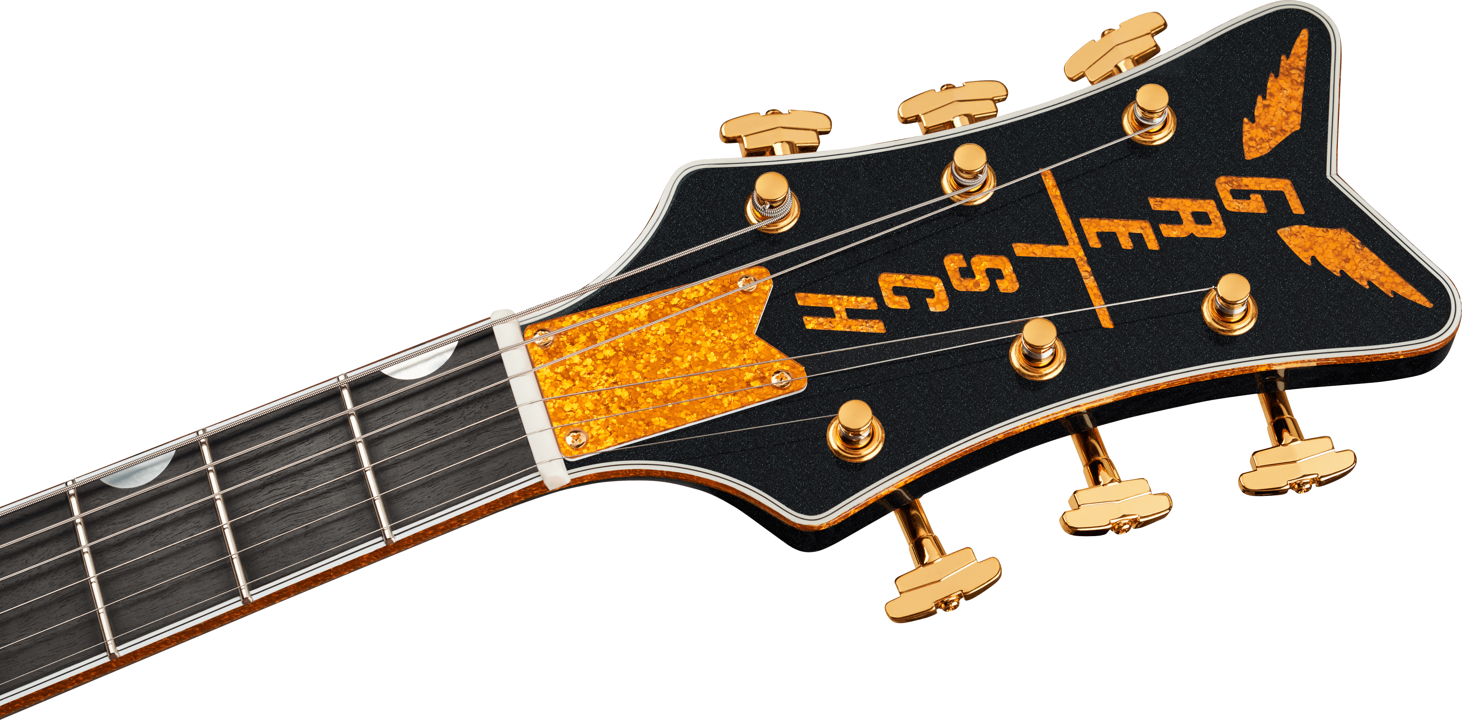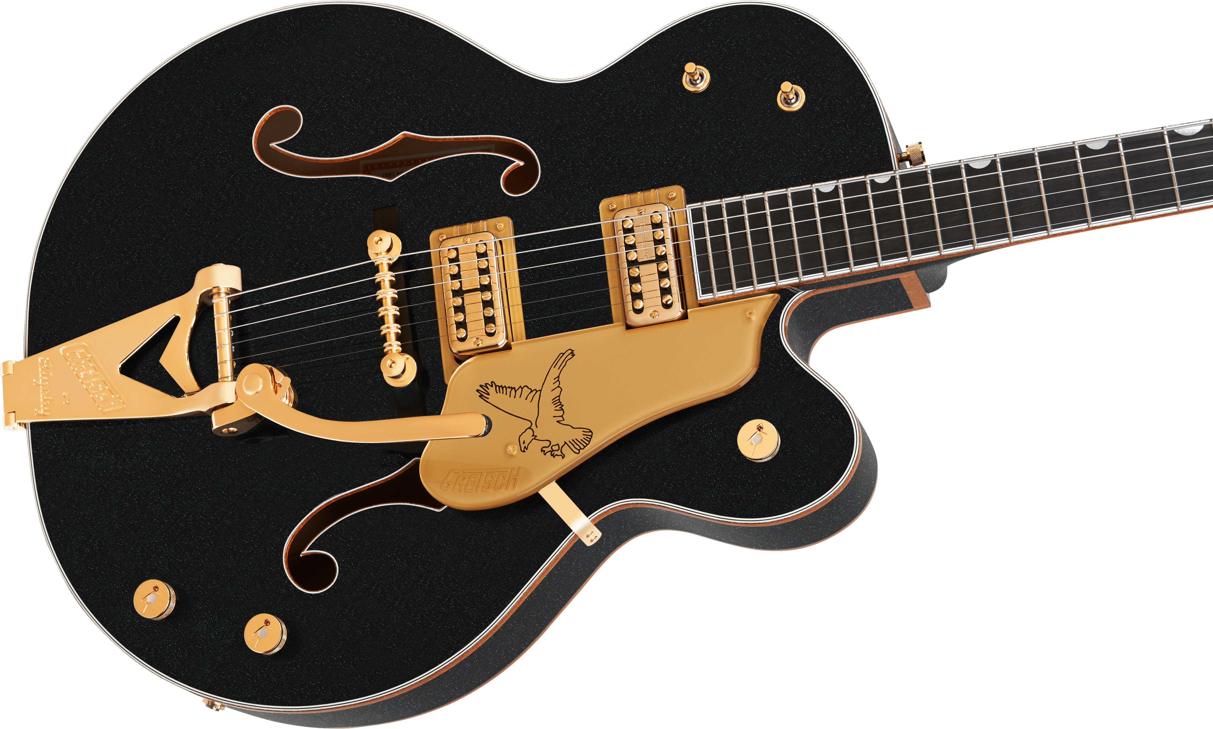 Bridge Space Control™ Hardware Finish Gold Tailpiece Bigsby® B6GP String-Thru Tuning Machines Grover® Imperial™ Pickguard Gold Plexi with Gold Gretsch® Logo and Falcon Graphic Control Knobs Jeweled G-Arrow Switch Tip Gold