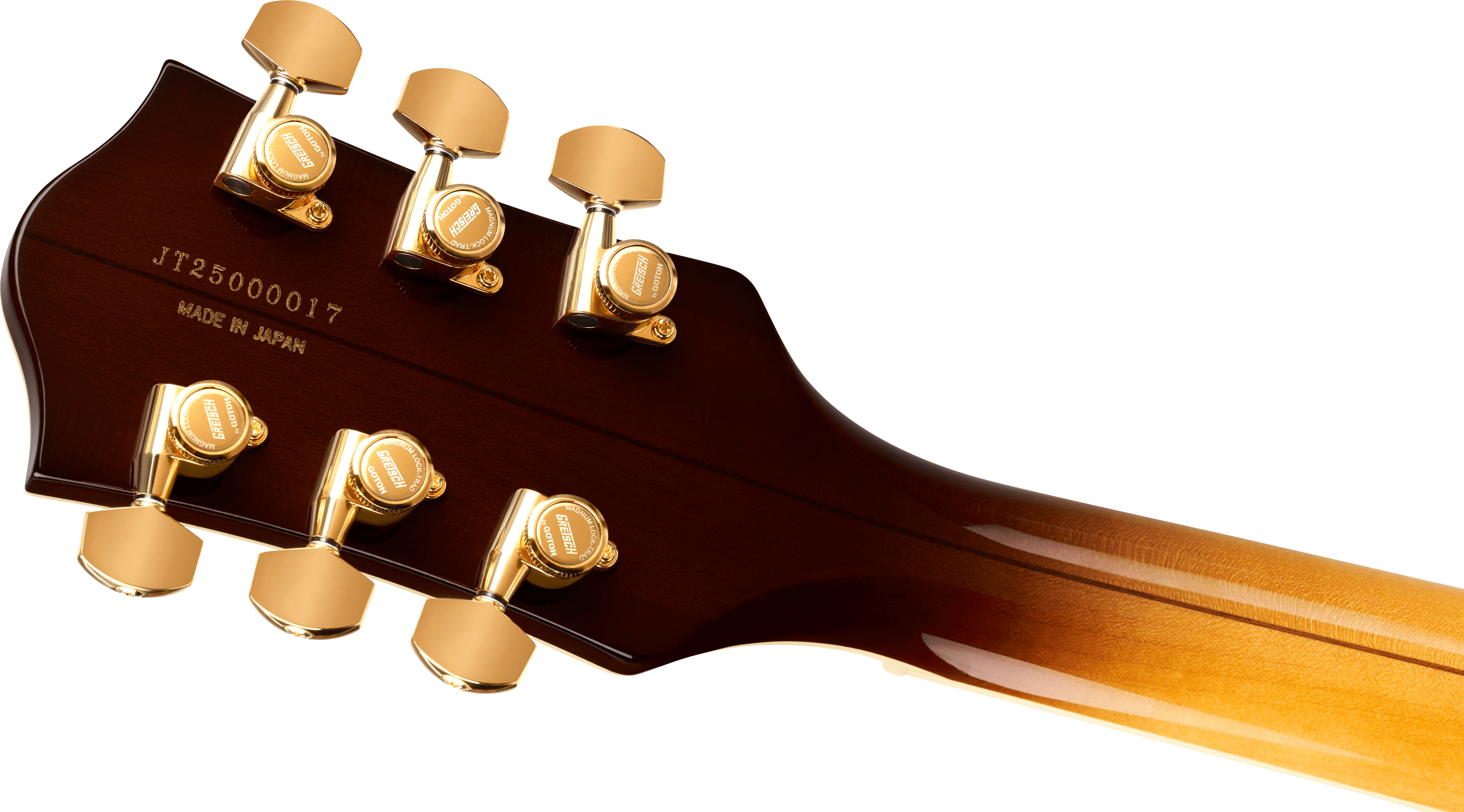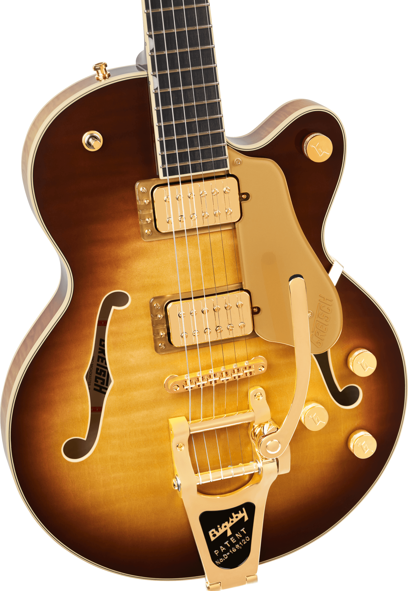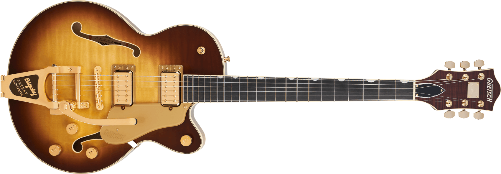 Bridge Adjusto-Matic™ Hardware Finish Gold Tailpiece Bigsby® B7GP String-Thru Tuning Machines Gotoh® Locking Pickguard Gold Plexi with Gold Gretsch® Logo Control Knobs G-Arrow Switch Tip Gold