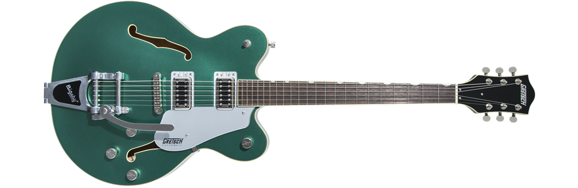 Painstakingly crafted with essential Gretsch sound, style and playability, the G5622T now comes in several remarkable finishes including Imperial Stain, Orange Stain, Single Barrel Burst (NEW) and Speyside (NEW) with gold pickguard and gold pickup bezels, or in Aspen Green, Dark Cherry Metallic and Georgia Green with silver pickguard and silver pickup bezels. All models feature nickel hardware.
