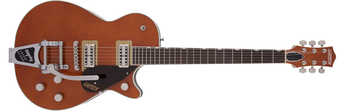 Bridge Anchored Adjusto-Matic™ Hardware Finish Nickel Tailpiece Bigsby® B7CP String-Thru Tuning Machines Gotoh® Locking Pickguard Tortoise with Gold Gretsch® Logo Control Knobs G-Arrow